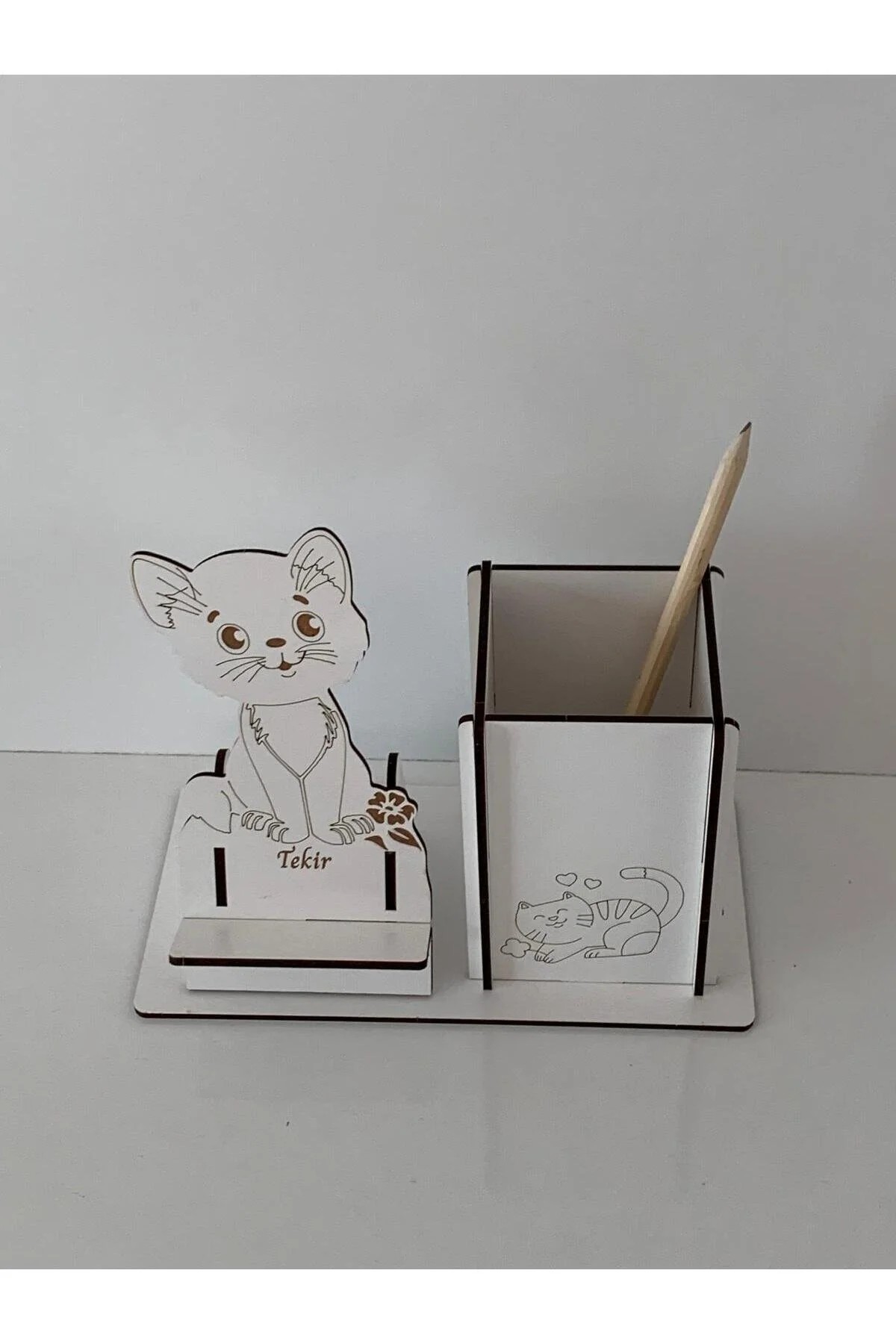 Ahşap Kedi Motifli Kişiselleştirilebilir Telefon Tutucu Ve Kalemlik